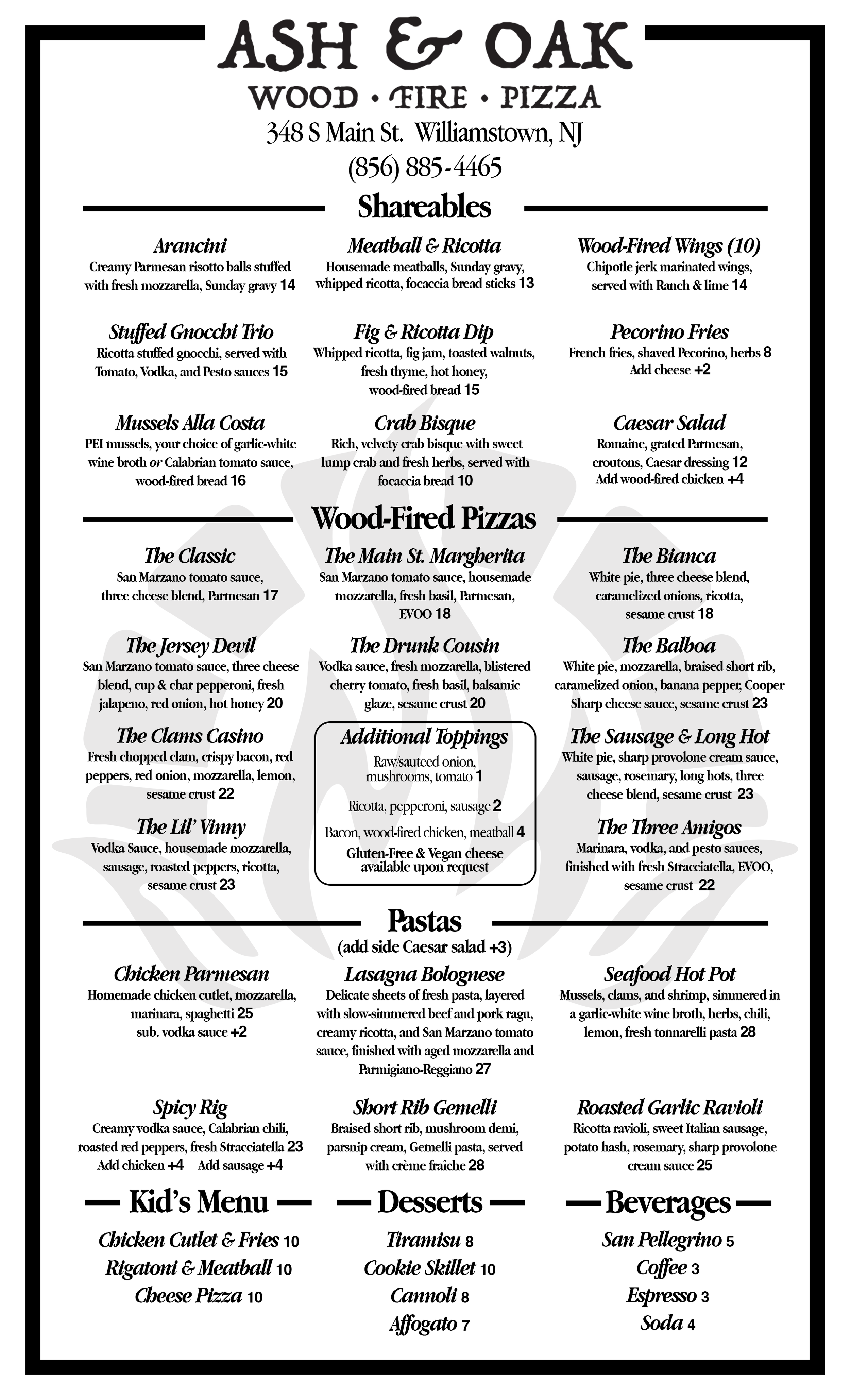 Ash & Oak began its journey as a humble food truck called the Traveling Tomato, bringing authentic wood-fired pizza to festivals, events, and neighborhoods throughout New Jersey. Our passion for crafting simple, high-quality pizza using fresh, local ingredients quickly gained a loyal following. Now, we're excited to open our first brick-and-mortar restaurant on Main Street in Williamstown, New Jersey. Rooted in tradition but driven by innovation, Ash & Oak is where the warmth of the fire meets the heart of Italian-inspired cuisine, offering a space to share great food with friends, family, and neighbors.